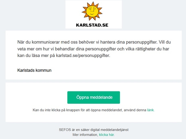 Sedan en tid tillbaka kan vi på överförmyndaravdelningen skicka känslig information digitalt. När vi skickar ett säkert mejl framgår det att avsändaren är Karlstads kommun, men inte vilken avdelningen eller person det är från. Som avsändare anges Säkra meddelanden eller sakrameddelanden@karlstad.se. Se skärmklippet nedan som visar hur ett mejl som skickats via säkra meddelanden kan se ut. För att kunna läsa meddelandet behöver mottagaren klicka på det gröna fältet där det står Öppna meddelande. Sedan väljs identifieringsmetod, FREJA eID eller Mobilt BankID, och först därefter visas själva mejlet.