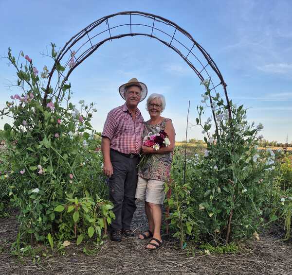 Det började under första pandemiåret. Vi, Helen och Rolf, tyckte det kändes tråkigt att hemestra och ville göra något trevligt både för egen del och för att glädja andra. Intresset för odling fanns sen tidigare och vi sa helt enkelt att vi sår lite extra blommor och har självplock. Tanken var att man skulle kunna ta med sin mamma eller någon annan som inte kom ut på så mycket annat den sommaren. Till en början var det inte så mycket större ambitioner än så. Men det mottogs väl och har sen utvecklats vidare med både yta och utbud. Nu har vi även workshops med olika blomteman, och man kan beställa blomsterarrangemang till livets alla tillfällen. Allt med närodlat och hållbart odlat blomster!