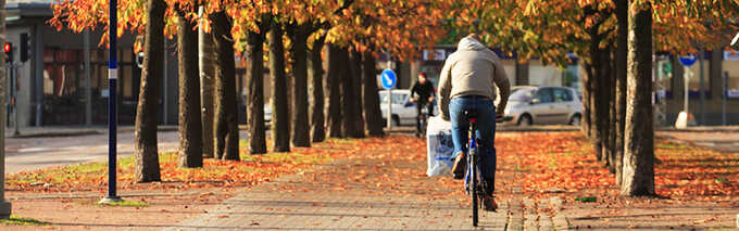 Person cyklar längs en trädkantad gata täckt med höstlöv.