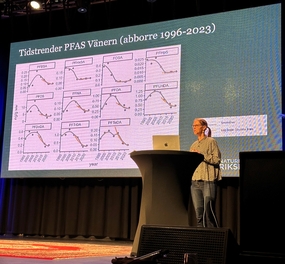 Suzanne Faxneld, Naturhistoriska Riksmuseet, presenterar rapporten tidstrender av PFAS i fisk från Stora sjöar. Resultaten visar på nedåtgående trender av alla detekterade PFAS från början/mitten av 2000-talet i Vänern.