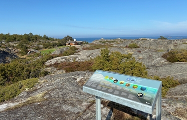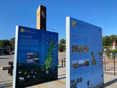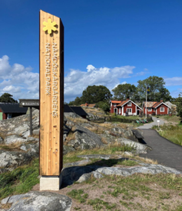 Informationsplats i Stavsnäs vinterhamn. Härifrån utgår Bullerölinjens turbåtar till nationalparken.