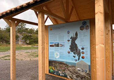 Informationsplatsen vid Rävängen. Här finns informationstavlor och kartor samlade under ett skärmtak. I närheten finns tillgänglighetsanpassade rastbord samt jaktstugan med sin utställning. Foto: Länsstyrelsen.