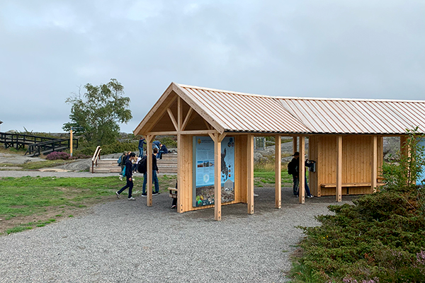 Informationsplatsen med informationstavlor under skärmtaket vid Rävängen, erbjuder även sittplats och vindskydd blåsiga dagar.