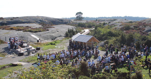 Närmare 300 personer närvarade vid invigningsceremonin på Bullerö. Från den nybyggda gradängen framför jaktstugan hölls tal, samtal och musikframträdanden. Foto: Länsstyrelsen.