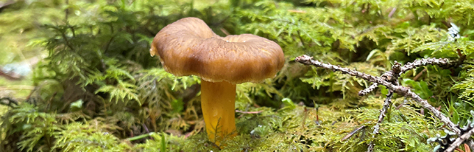 Närbild på trattkantarell i mossa