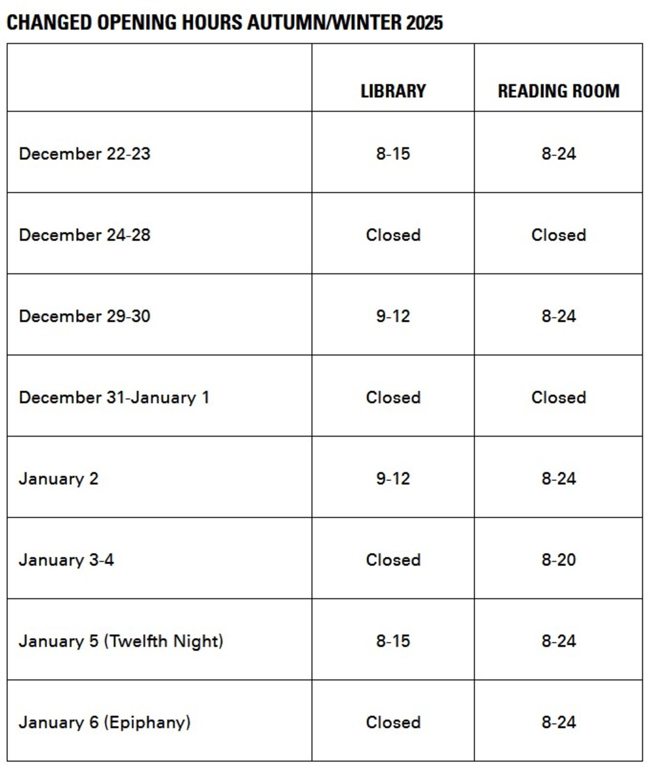 During the upcoming holidays the library's open hours will be changed slightly, see the chart below.