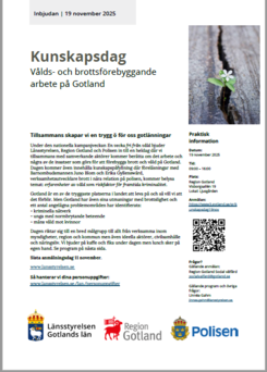 Under den nationella kampanjveckan En vecka fri från våld bjuder Länsstyrelsen, Region Gotland och Polisen in till en heldag där vi tillsammans med samverkande aktörer kommer berätta om några av de insatser som görs för att förebygga brott och våld på Gotland. Dagen kommer även innehålla kunskapspåfyllning om våld som riskfaktor för framtida kriminalitet bland annat med Barnombudsmannen Juno Blom och Erika Gyllenswärd, verksamhetsutvecklare brott i nära relation på polisen.